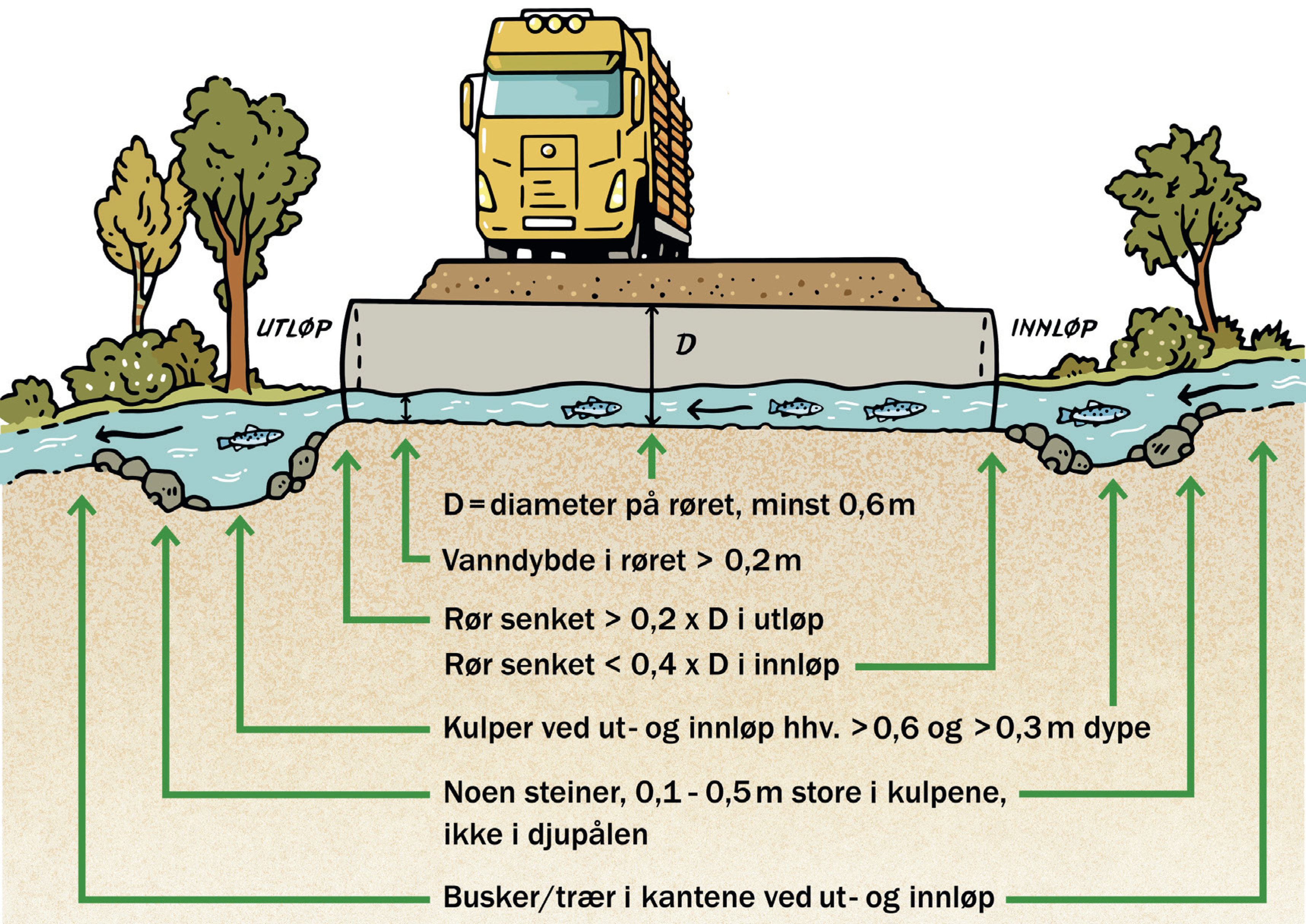 - Jo større rørdiameter som brukes, desto bedre for fisken. Stor diameter er også en fordel ift. styrtnedbør, og for å unngå tetting pga. kvist/is osv.