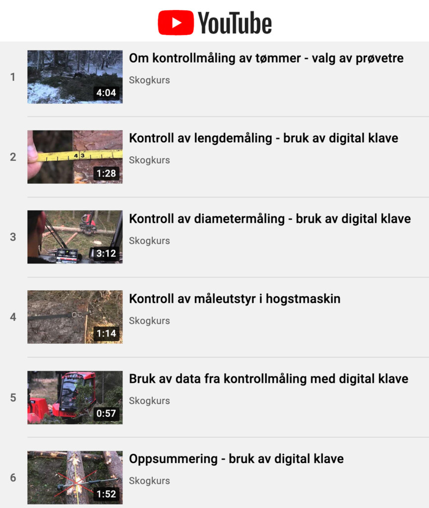 Denne spillelisten inneholder 6 kortfilmer om ulike trinn i kontrollmåling av tømmer med digital klave. Filmene er produsert i et samarbeid mellom Skogkurs og Skogforsk i Sverige.
