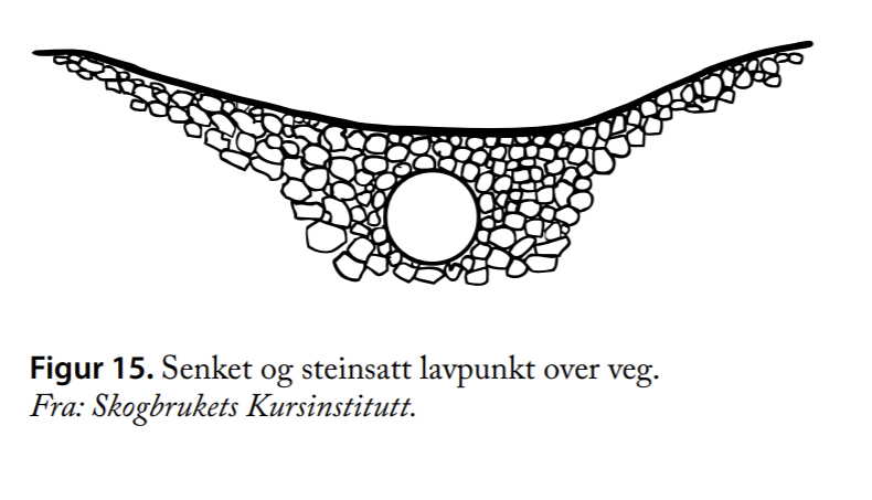 I lengre, bratte stigninger vil en steinrenne (dump av grovere stein på tvers av vegen) redusere vannhastigheten i vegbanen og fungere som overflaterenne/ stikkrenne.