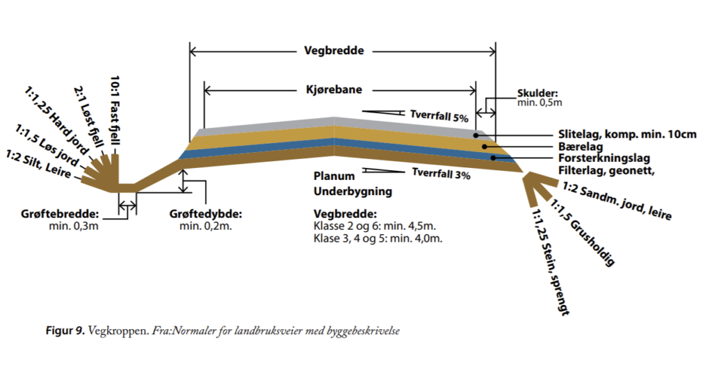 Normaler for landbruksveger med byggebeskrivelse Landbruks- og matdepartementet (1997) gir retningslinjer for utforming av vegen i henhold til vegklassenes tekniske standard. Tiltak i veganlegget kan gjøres for å redusere skaderisikoen ved ekstrem nedbør og flom. Vurdering av skredrisiko bør være med i forvaltningsprosedyren i utsatte områder. Dette gjelder særlig der vegen går i bratt terreng eller i leirterreng der det kan være fare for kvikkleireskred. Der vegen skal gjenoppbygges etter det har gått skred er det fornuftig å søke å avklare hvorfor det har gått skred og gjenoppbygge vegen slik at en unngår nye skredhendelser.