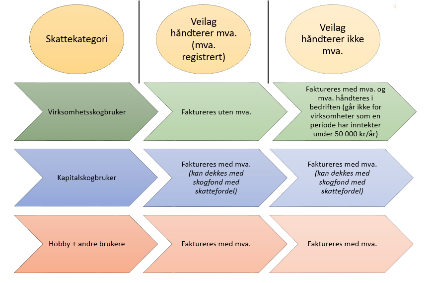 Dersom veilaget ikke er mva-registrert kan de håndtere arbeidet og fakturere ut andel av kostnaden til den enkelte skogeier. Veilaget må da fakturere hele kostnaden inkl. mva og uten at mva. spesifiseres. Dermed blir mva. en kostnad for alle skogeierne. En variant er at veilaget tilrettelegger for en splitt av hver enkelt innkommen faktura på arbeidet, såkalt fakturasplitt til alle medlemmene. Den enkelte skogeier betaler da sin andel av hver faktura og utgiftsfører hele beløpet inkl. mva. En tredje mulighet er at én av de mva-registrerte skogeierne tar kostnadene og viderefakturerer kostnadene med påslag av mva. til de andre eierne. Dette forutsetter at alle er betalingsdyktige slik at den som tar fakturaen i første runde er sikker på å få dekket sin viderefakturering.