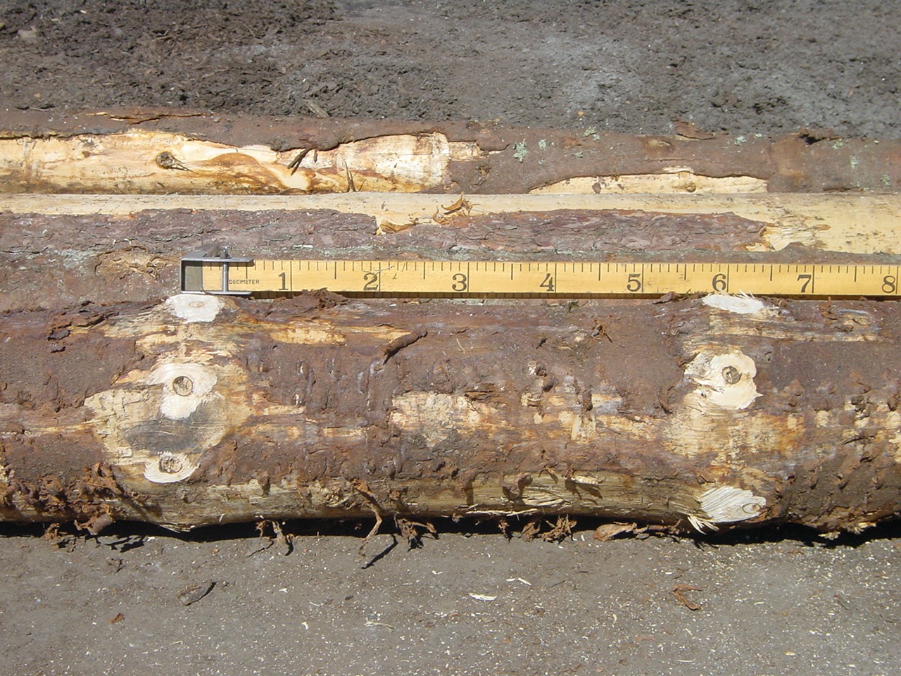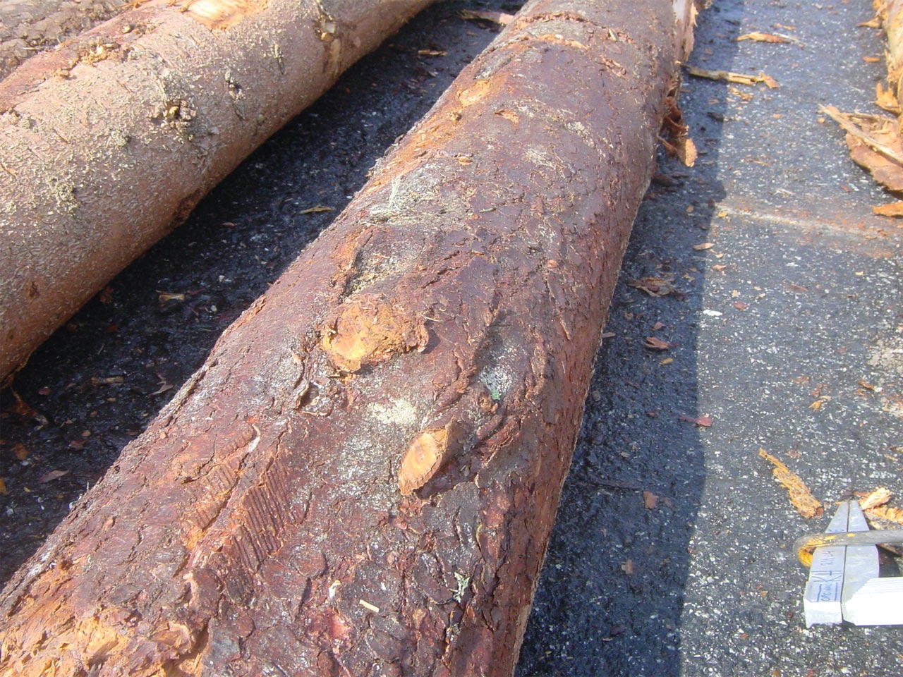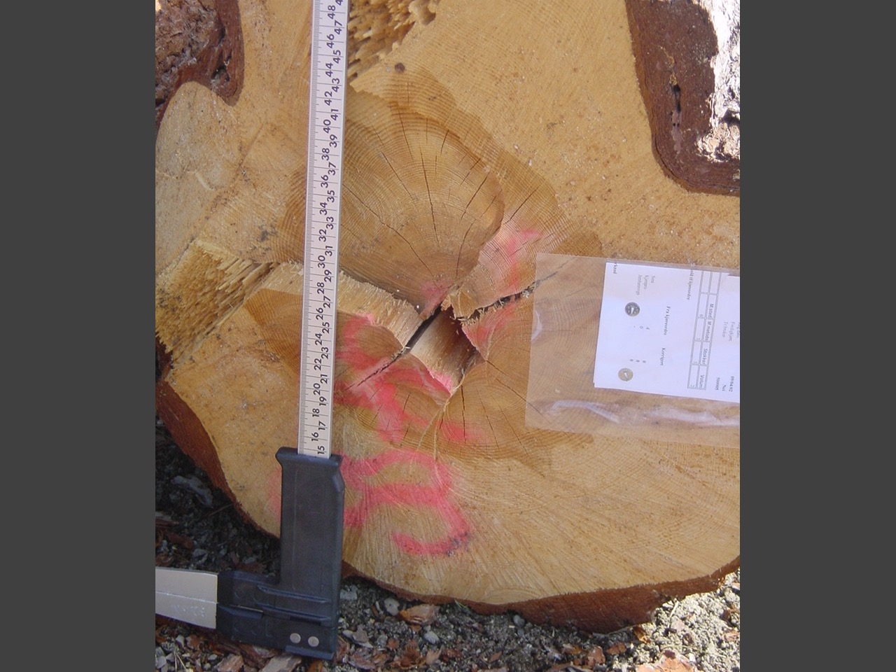 MARGSPREKK – Langsgående sprekk gjennom margen på stokken. Slike sprekker oppstår mens treet står på rot, oftest på store, gamle trær.