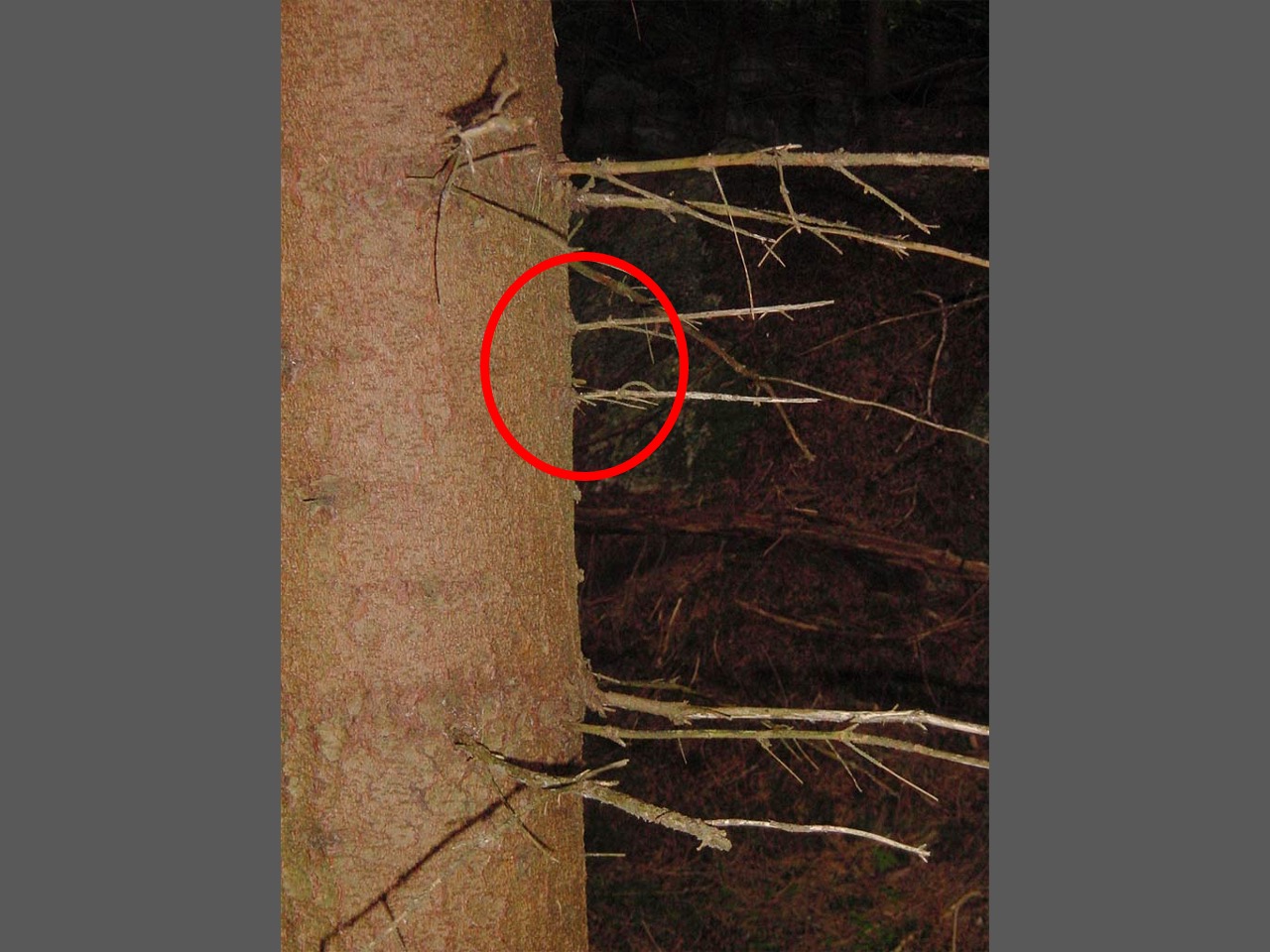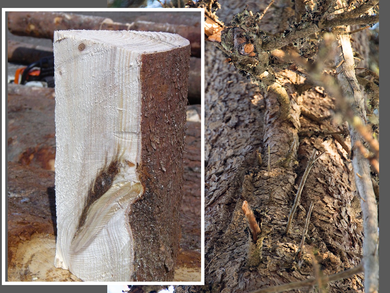 HENGEKVIST: Sterkt hengende kvist, finnes særlig på gran fra høyereliggende strøk(ofte barkdragende).
