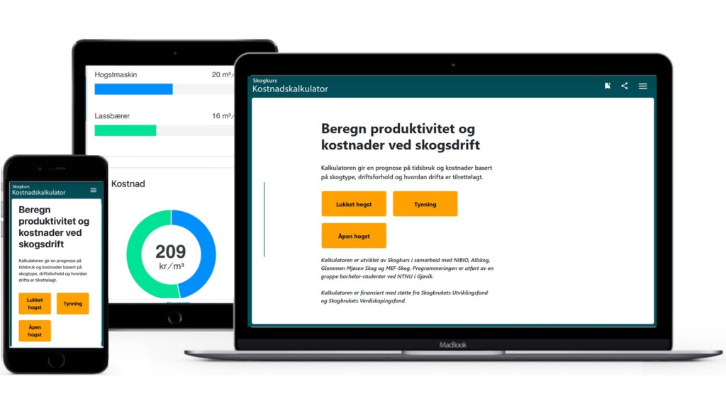 Kalkulatoren er utviklet av Skogkurs i samarbeid med NIBIO, finansiert i et spleiselag mellom Skogbrukets verdiskapingsfond, Statsforvalterne, Skogkurs og næringen selv.