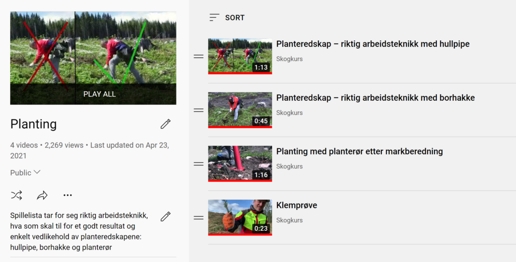 YouTube-spillelista Planting inneholder 4 videoer med fokus på riktig arbeidsteknikk, plantingens utførelse og vedlikehold av redskapene: hullpipe, borhakke og plantebor.