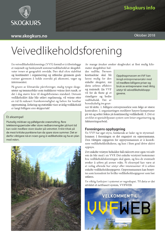 Dette info-arket er en kort oppsummering av innholdet fra forløperen til innholdet på denne temasiden om veivedlikeholdslag, – Kongsvingermodellen. Info-arket går kortfattet inn på veivedlikeholds-forening/-lag (begrepene forening og lag kan brukes om hverandre), samt litt om økonomiprogrammet VVFWEB.