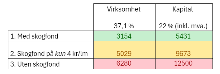- Kapitalskogeier får ikke utgiftsført kostnader utenfor skogfondssystemet og må dessuten dekke mva. for dette beløpet (dette er altså bakt inn i eksempelet).