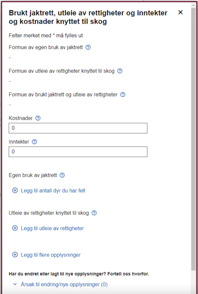 Her er det mulig å hente opp et tillegg som heter «Bruk av jaktrett, utleie av rettigheter og inntekter og kostnader knyttet til skog». I dette oppslaget skal inntekter og kostnader for kapitalbeskattet skog rapporteres i den nye skattemeldingsversjonen.
